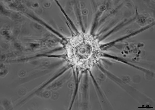 Actinocoma ramosa is very sensitive to light. It reacts immediately when it comes within the light path of the microscope. It retracts its long pseudopodia and broad veils. What remains is a more or less spherical body with rod-like short pseudopodia moving and waving restlessly.