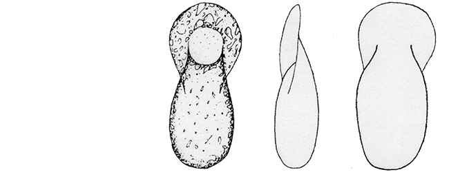 Dimensions: Length 45-64 µm; width 22-31 µm; thickness 14-19 µm; aperture 13-18 µm; visor 28-38 µm.