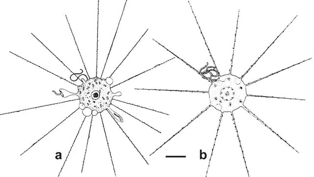 Diagnosis: Ciliophrys with tapering arms; nucleus large, prominent, with a central nucleolus and additional peripheral heterochromatin. Radiating arms with extrusomes. The single cilium is held in front of swimming cells, and in non-swimming (feeding) cells the cilium is held tightly curled, typically in a double figure of 8.