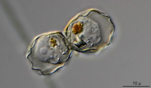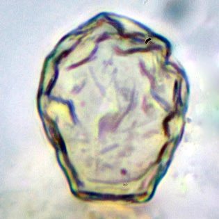 Dimensions: Playfair length 17-20 µm, breadth 14-16 µm; other authors: shell length 15–20 μm, shell width 10–16 μm, aperture diameter 4 μm; my measurements: length 15-18 µm.