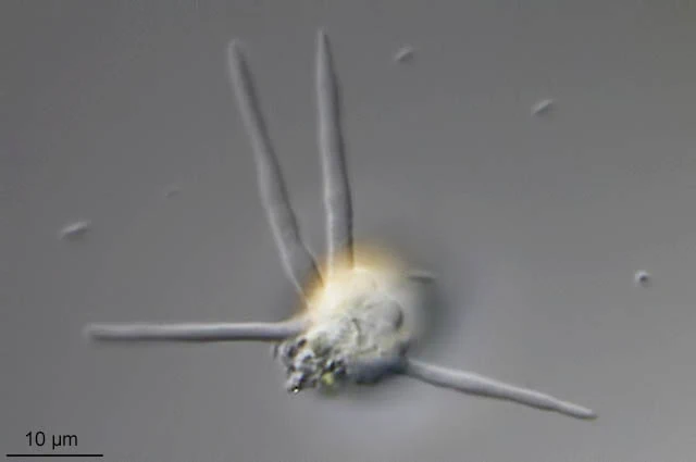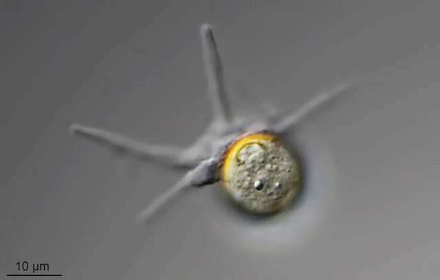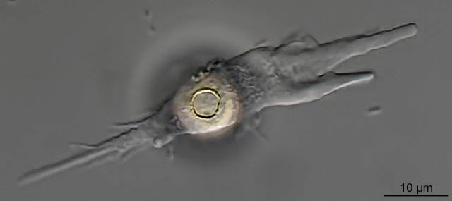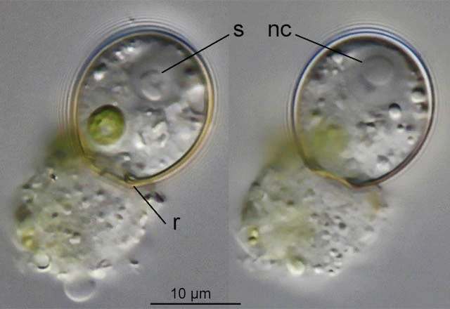 This small ovoid, almost spherical, Cryptodifflugia species was present in a sample brought from Cuba by a tourist (2018). The sample was a piece of moss on a tree about 1 km from the cabin where Fidel Castro had his command post in 1958. The moss was rinsed with demineralized water. The water was kept in a glass with sediment on the bottom. I made some wet mounts of the sediment. This species multiplied easily both in the sediment and the wet mounts. The nucleus was remarkable because of a second smaller kind of nucleolus or something else, between the larger central nucleolus and the nucleolar membrane. The specimens also carried a lot of debris around the aperture.