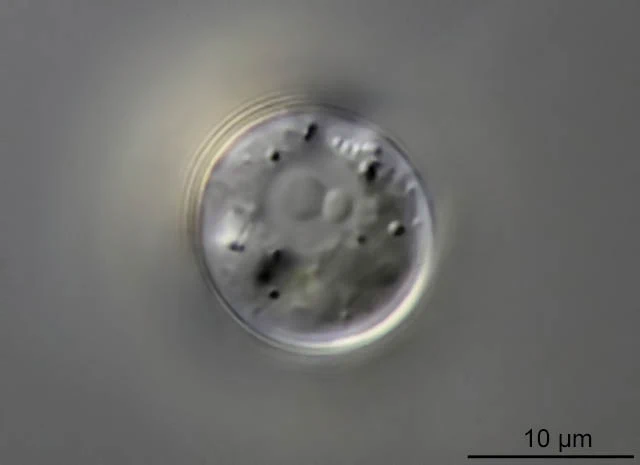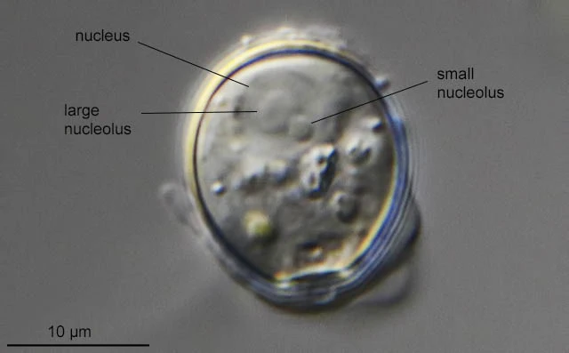 Measurements: Shell Length 16.0-18.1 µm, Breadth 14.5-15.6 µm, L/B 1.1-1.2; aperture 3.8-4.5 µm; nucleus 6.0-6.4 µm, central nucleolus 3.2-3.4 µm, eccentric ‘nucleolus’ 09.-1.6 µm (n=4).