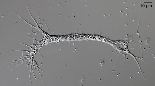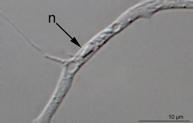Remarks: I found this specimen in a two months old sample. The amoeboid showed up in a moist chamber preparation after two days. It didn’t move, only changed its fine subfilopodia. There was a continuing bidirectional streaming of granules. The specimen had about ten nuclei, in shape varying from spherical to elongated elliptical. There were several contractile vacuoles. The sample came from the Rotes Wasser, Germany.