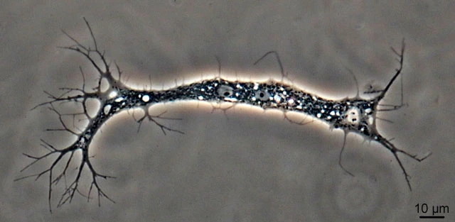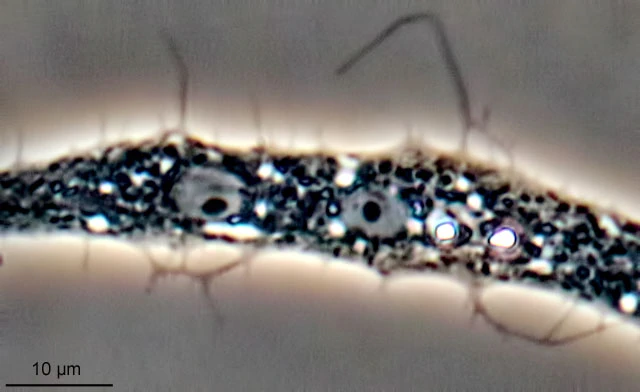 This specimen below showed up in the same sample, but one day later. I had only time to make some photomicrographs. When I returned some hours later, it was gone. It had two nuclei, visible as two eyes in the central part. There was also a distinct bidirectional streaming. I’m not sure if this specimen is identical to the one above.