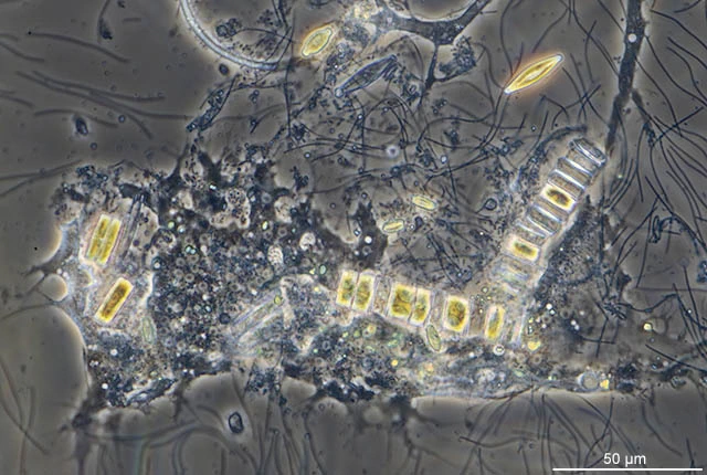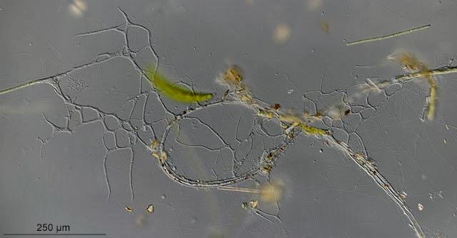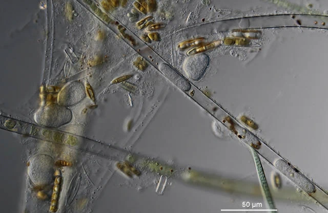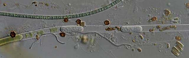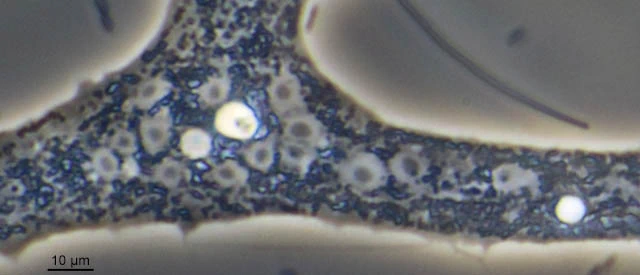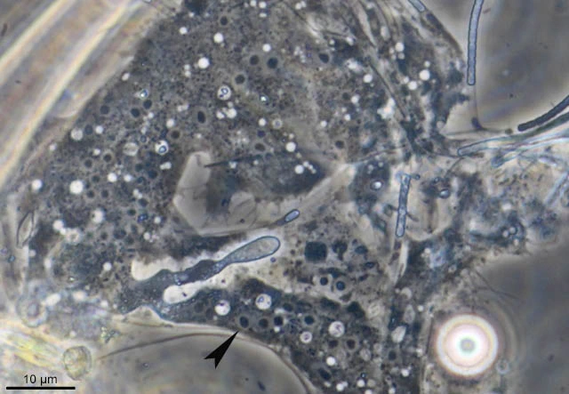 Darbyshirella inside a filament of a blue algal. The reddish brown spots are digested algae.