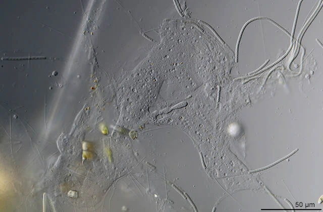 I found this Darbyshirella species in a sample from a freshwater aquarium. This sample was send to me by Wolfgang Bettighofer. I kept some wet preparations in my humidity chamber. After about ten weeks I found several specimens of this Darbishirella species attached to the cover glass, while some cells could be observed inside filamentous blue algae. Obviously these cells were consuming the content of the algae. In and outside these algae a number of double walled cysts were observed. These cysts were mostly circular or elongated, sometimes irregular in outline.