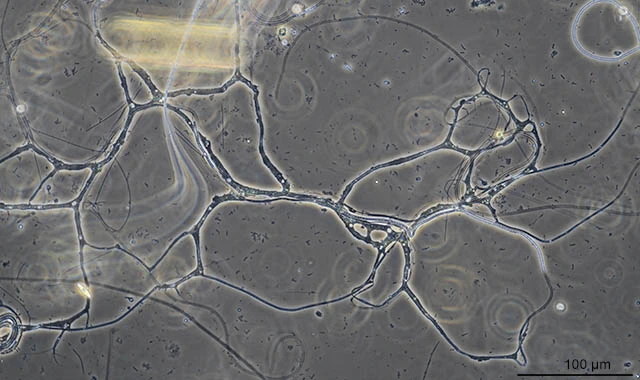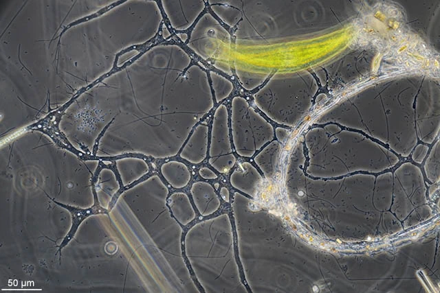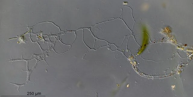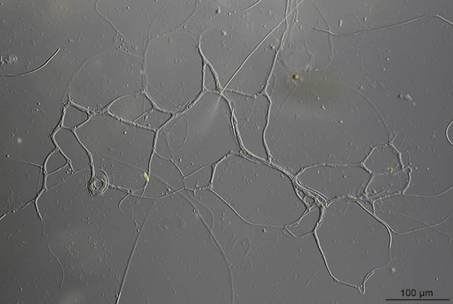 This reticulum is more than 1 mm large. A part of the cell is present inside the filament of the alga in the central part of the image.