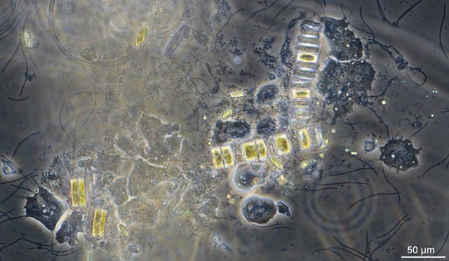 This is a flattened multinucleated cell. At the top two strings of a reticulum are visible. Probably the diatoms have been captured by the cell.