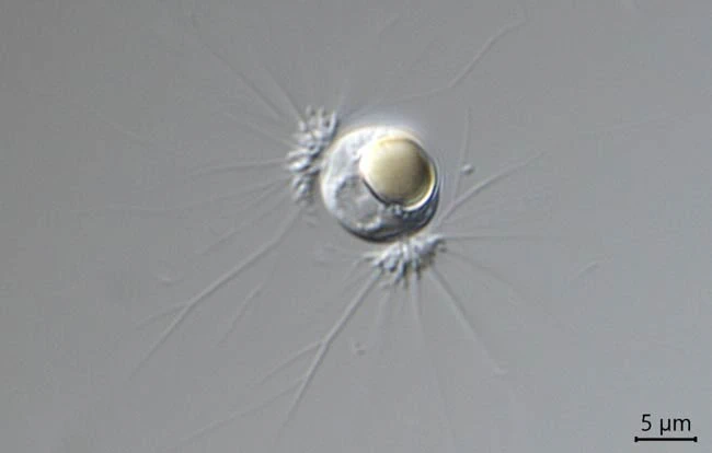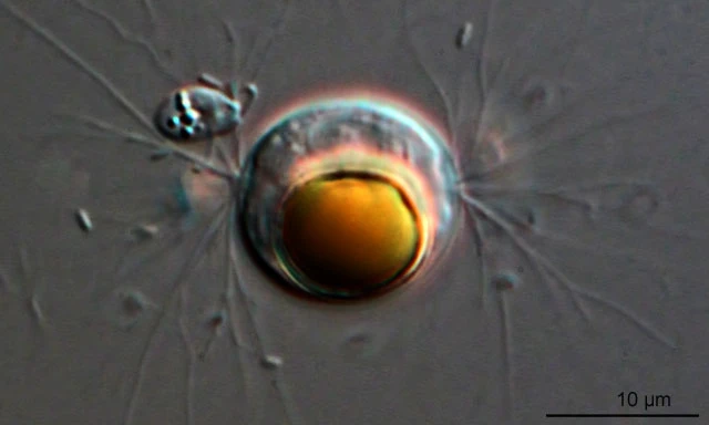 Diagnosis: Cell spherical or somewhat elliptical, covered with a thin, hyaline and colorless membrane; two circular pseudostomes situated at two more or less opposite poles; cytoplasm colorless, transparent, finely granulated, filling the envelope except near the two pseudostomes; a single nucleus with a nucleolus; one or more contractile vacuoles; one large, or two or three small, grayish, yellow, red or orange colored, oil-like globules present; pseudopodia extremely attenuate, in locomotive cells radiating, straight or dichotomously branched, in stationary cells curved and branched and attached to the substrate; reproduction by fission or tetrad division. Young cells frequently aggregated into colonies which form circular masses about 30-60 µm in diameter or more; from the periphery of which slender pseudopodia radiate.
