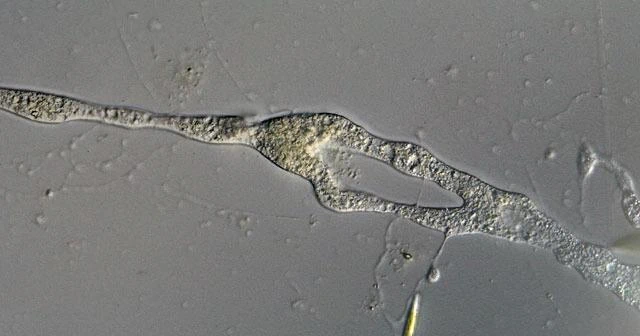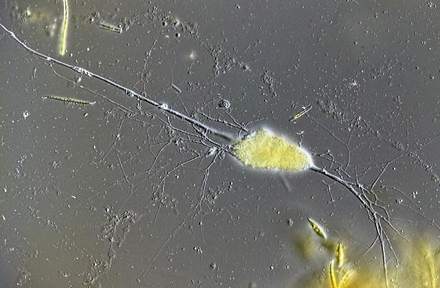 This specimen was observed in wet Sphagnum from Germany. It had few very long granoreticulopodia, up to 5 mm. The cell body was c. 300 µm. This body mass could stream through one long pseudopodium and split up in smaller bodies along its pseudopodia. The cell body was covered by a thin tectum which was clearly visible when plasma strands left the body. I’m not sure wether this is an undescribed species or Dracomyxa pallida.
