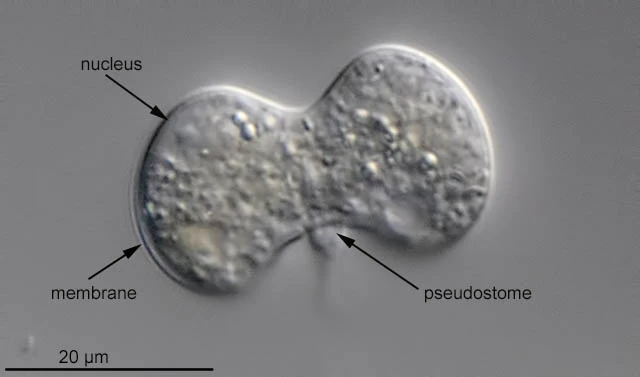 Beginning of observation; one of two nuclei is visible; there is one pseudostome.