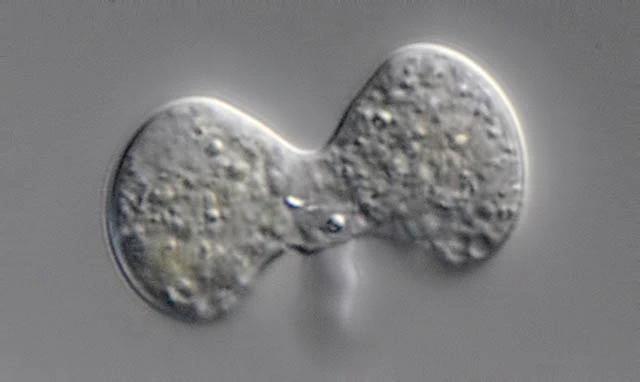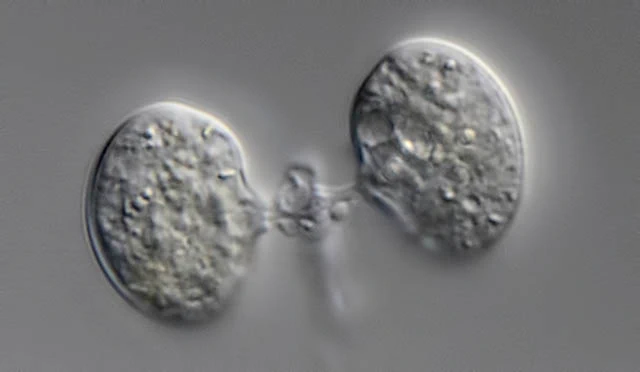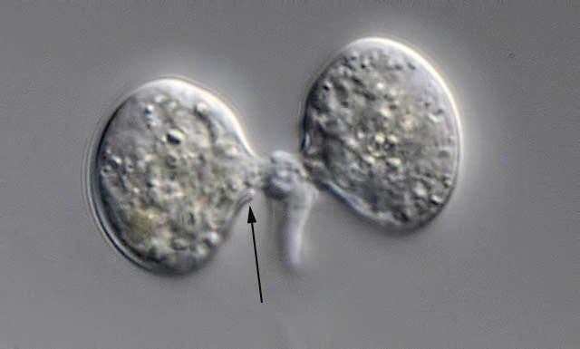 December 16 I had several specimens of a large naked Frenzelina species in a wet mount which I had kept for over two weeks in de moisture chamber. I could observe a division of one specimen, at least the last part of it. It’s a longitudinal division, which means that the division starts at the “dorsal” side and ends with the division of the mouth or pseudostome.