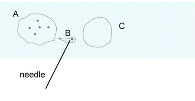 Once located, the amoeboid is trapped in a small droplet of water (see drawing below, A). Using another pipette, I place a drop of distilled water (B) next to the droplet containing the amoeboid. I then use a fine needle or sable hair to guide the amoeboid to the edge of its droplet and, with a swift motion, sweep it out. During this movement, the amoeboid becomes suspended in a small droplet (B) between the original and distilled water droplets. Continuing the sweep, I guide the amoeboid into the distilled water droplet (C) in one continuous motion.