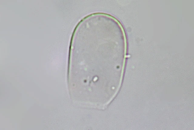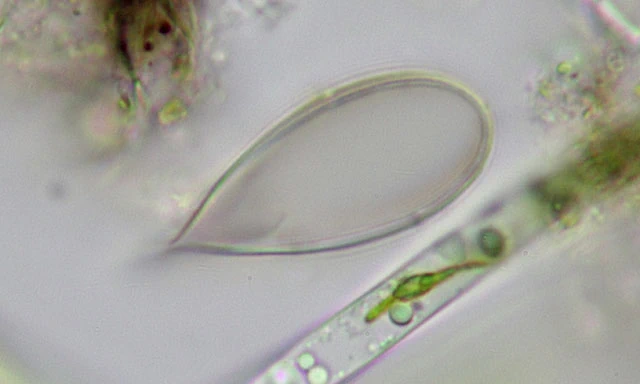 Diagnosis: Shell transparent, wide ovoid in broad view, barely longer than wide, and slightly narrowing towards the pseudostome. In profile, elongated elliptical with a notched pseudostome. Pseudostome linear, nearly as wide as the shell.