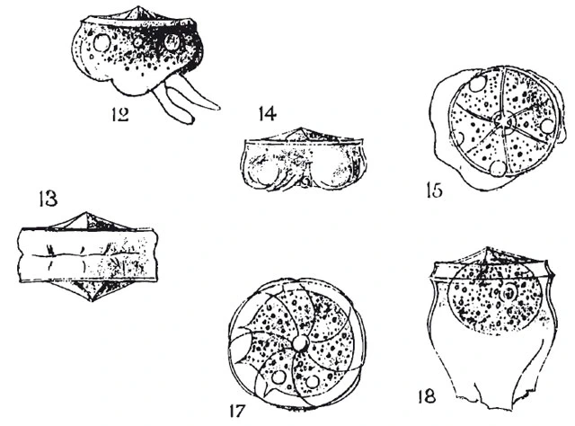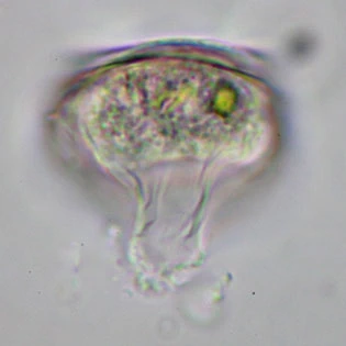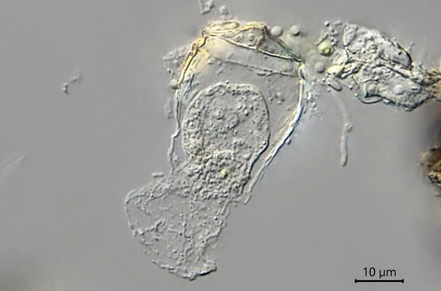 Remarks: The cell body does not fill up the test. Cytoplasm is greyish and granulate. It contains small food particles as well as several vacuoles. Epipodia and pseudopodia are formed (Penard 1917). The cell is mononuclear. The nucleus has a diameter of 5-6 pm . It has a variable shape: hemispherical, oblong, compressed or oval and has got a central nucleolus (Penard 1917).