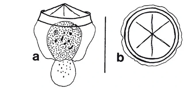 Diagnosis: Upper test part flat, of slightly conical shape (not dome shaped as with other species) having a somewhat raised centre point, colorless, less frequently slightly yellowish. In dorsal view, round, surrounded by two concentric rings, from the centre of which 5-8 (rarely up to 10) lines irradiate. The external ring of the two concentric rings may also be missing. The lower test part is a flexible, thin, plicate, open at the bottom and colorless membrane, which can be highly contracted. The test is purely organic in composition.