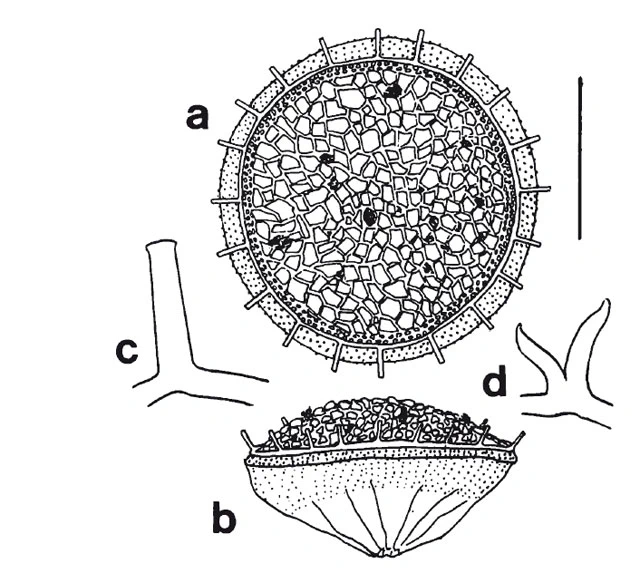 Diagnosis : The author found only few specimens of this species in one of several moss samples, but not together with M. suctorifera described below. Upper test part with shallow curvature and low cuticular collar that extends to form 16 to 20 radially protruding annexes. Annexes are equally long, have the same structure and are equidistant. The upper test part is covered with mineral splinters inside the cuticular collar. Shell brown.