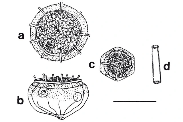 Diagnosis: Upper test part dome-shaped. The shallow or only slightly curved centre of upper test part is covered with small mineral fragments, here and there also with small detritus particles. The centre is surrounded by an annular, closed cuticular collar; at its side, there are nine tubular annexes with open ends. Annexes have a length of 11 µm and a diameter of 2.7 µm. The test colour is pale grey-yellow.