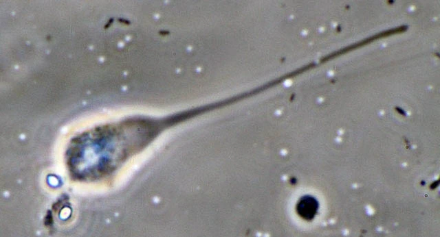 Diagnosis: Locomotive form with a long tapering pseudopodium which actively waves around; this leading pseudopodium frequently attaches to the substrate permitting the cell body to flow into it to form a flattened cell. Flattened forms with short paired pseudopodia; long pseudopodia granular except the tip; floating form spherical with blunt radiating pseudopodia; single nucleus; crystals present.