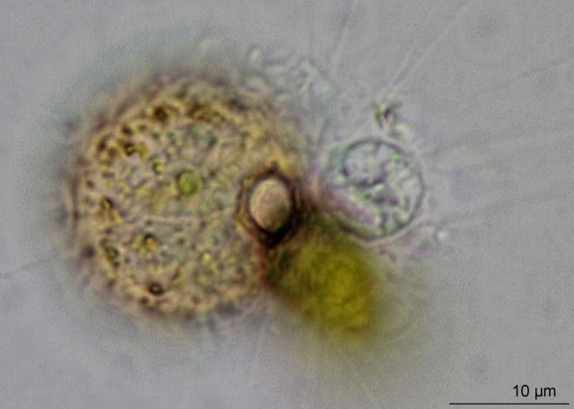 Dimensions: De Saedeleer 25.5 µm long and 23 µm broad; nucleus c. 8.5 µm (n = 3); my measurements: 21 µm.
