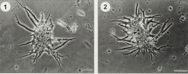 Diagnosis: Synamoeba arenaria forms a meroplasmodium, i.e., a permanent association of cells connected by a reticulopodial network. The diameter of the network increases with the age of the organism. Within the network, there is an incessant streaming of ground cytoplasm and particles. While the particles in the larger reticulopodia appear to move in well-defined cytoplasmic streams, the movement of single smaller particles is saltatory with mean velocities of about 15 µm/s.