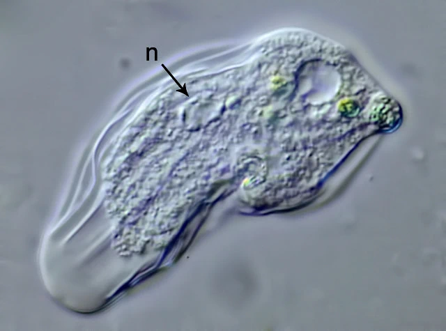 Diagnosis: Locomotive form, usually between 30 and 350 µm long, flattened and oblong in outline, often with several parallel folds or wrinkles. Anterior edge semi-circular with an extensive hyaloplasm that can occupy more than half the cell. Posterior edge often slightly convex, sometimes with a knob uroid. Form of the nucleus is an important diagnostic feature for delineating species, and thecamoebae can have a single spherical or ovoidal nucleus with a central nucleolus, granular nucleolus, or nucleolus as 2 or 3 parietal pieces. Cytoplasm may have crystals and contractile vacuoles. No cysts known.