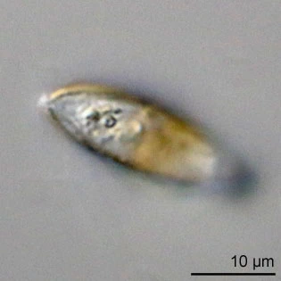 Diagnosis: shell ovoid, compressed; aperture slit-shaped with a short collar, one lip slightly longer than the other one; shell composed of oval siliceous scales, hardly visible; aperture region with much smaller scales; aperture scales not denticulated; nucleus vesicular, with central nucleolus; filopodia.