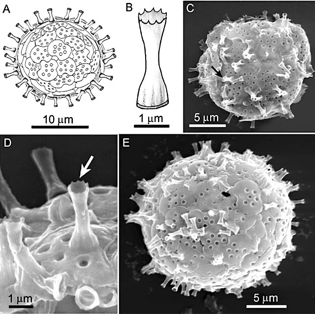 Diagnosis: Cells spherical, 20-25 µm in diameter, covered with both plate- and spine-scales (visible in high magnification, phase contrast light microscopy). Plate-scales are circular-elliptic (3-5 µm) but with one or two (usually) strongly rounded indentations occupying about one-quarter of the margin of the scale; plate-scales with a well developed marginal rim (about 0.13 µm wide) and a convex distal surface perforated with 6-12 circular holes, about 0.2-0.4 µm in diameter. Spine-scale, a short hollow tube (1.5 -3.3 µm long) with a swollen base about 1.1-1.2 µm in diameter, and a slightly flared distal end about 0.8 µm wide with 6-8 marginal small teeth. Occasional spine-scales have a greater flare at the distal end with an internal septµm dividing the opening leading to the hollow shaft of the scale into two parts. Spine base is reinforced with a series of thickened longitudinal ribs.