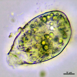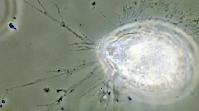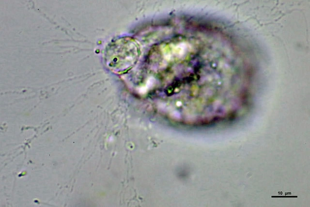 I found this amoeboid in a sample from a garden pond in Wellington, Florida. Before I could observe it better, it was suddenly dried… It’s curious because of the network of granulated filopodia which resembles those of Allogromia, but the shell is not covered with xenosomes, but is clear and organic.