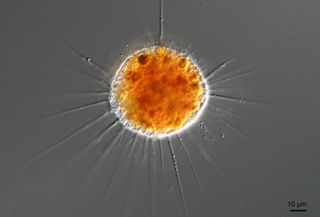 Intense orange coloration of the central cell body, periphery and pseudopodia colorless. Cells float freely in the water column, or perform stalking, paddling movements. Pseudopodia long and thin, tapering, mostly unbranched; hyaloplasmatic; more or less equally distributed over the cell, sometimes in tufts. Numerous, highly refractive granules, about 0.5-1.5 mm in size (membranosomes) moving along the pseudopodia, occasionally shooting rapidly out of the cell cortex connected by a thin cytoplasmic strand and subsequently retracted; the latter phenomenon results in the so-called ‘pin-like’ or ‘pinhead’ pseudopodia. Rarely formation of broad, claviform pseudopodia occurs; possibly related to pathological conditions. Occasionally numerous vacuoles present, predominantly in the peripheral cytoplasm, not always conspicuous at lower magnifications.